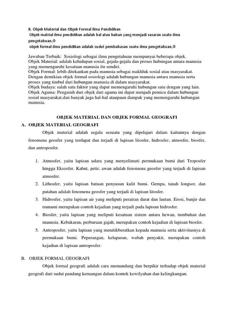 Objek Material Dan Objek Formal Geografi A Objek Material Geografi from imgv2-2-f.scribdassets.com Objek material geografi adalah sasaran atau isi kajian geografi. Berikut ini yang bukan prinsip yang digunakan untuk menganalisis gejala geografi adalah. Geografi mempunyai dua objek bahasan yaitu objek material dan objek formal. Berbagai macam pelanggaran yang dilakukan terhadap objek material geografi. Objek material geografi adalah sasaran atau isi kajian geografi. Objek material geografi yaitu sasaran atau yang dikaji dalam studi geografi. Objek material geografi adalah isi kajian geografi. Letak geografi dibedakan menjadi letak fisiografi dan letak sosiografi, misalnya letak fisiografi antara lain.